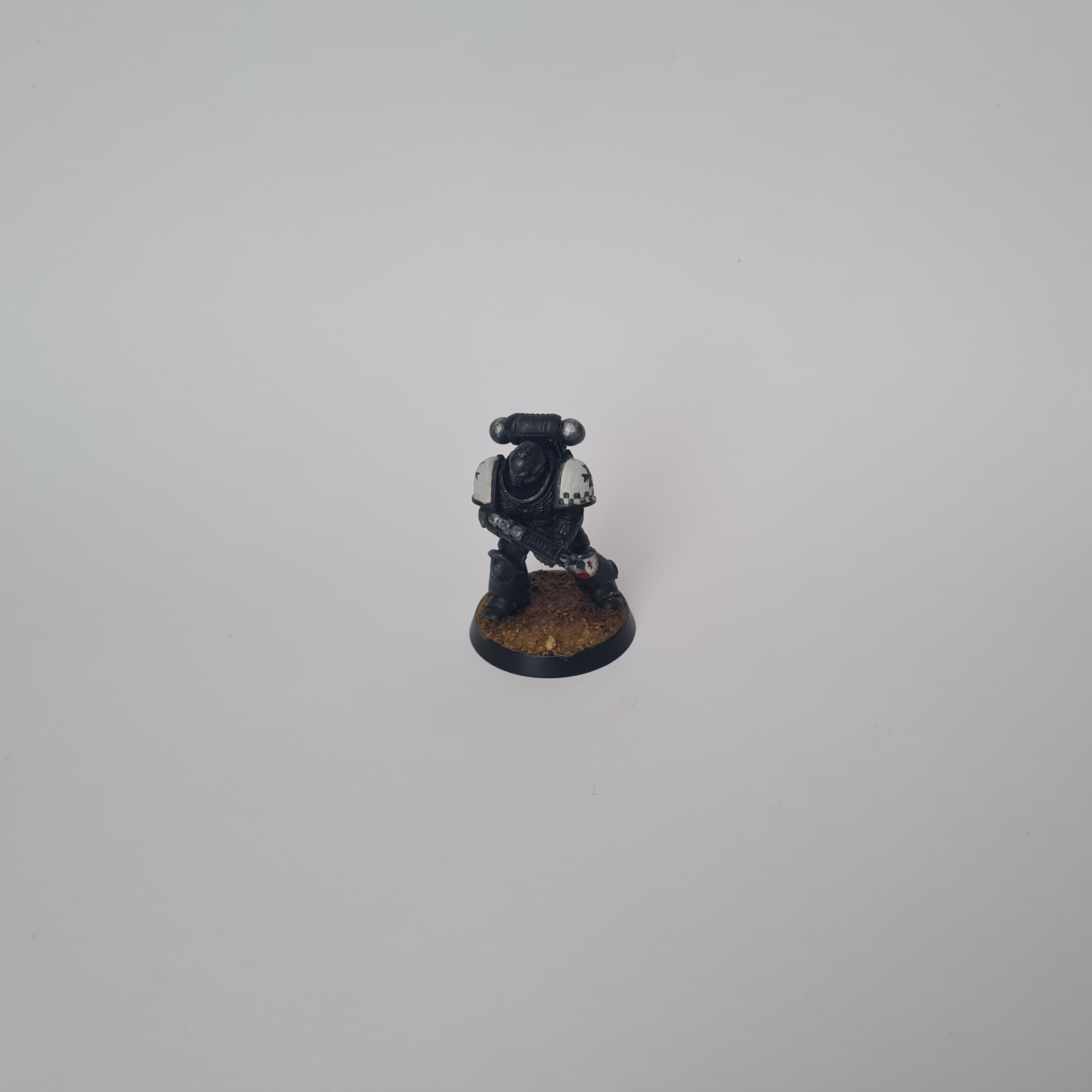 I knew a bit about the Black Templars from a few WD articles: the collecting article described above, and a battle report against Orks in the desert. I knew they are close combat oriented (a plus), are descendants of Imperial Fists, and have a strong affiliation with religous artifacts and symbols. I was confident I could paint them in a scheme using black armour like what I’d used for my Chaos Knights for Warhammer Fantasy. I really enjoyed painting these models and thought I could easily transport that scheme onto the Black Templars. During some reading and research I came across the Cult of Paint series on the Black Templars Army project, and I was really inspired by the available collection of models focused on the Black Templars. I decided there was enough going in the direction of Black Templars that I would just go for it and see how it felt - a bit risky, but at the end of the day if I just painted a single unit it wasn’t too much of a commitment. Friday after work I ordered a Black Templar Crusader squad from my local games store. That evening I worked on a test model for the scheme using an Intercessor.