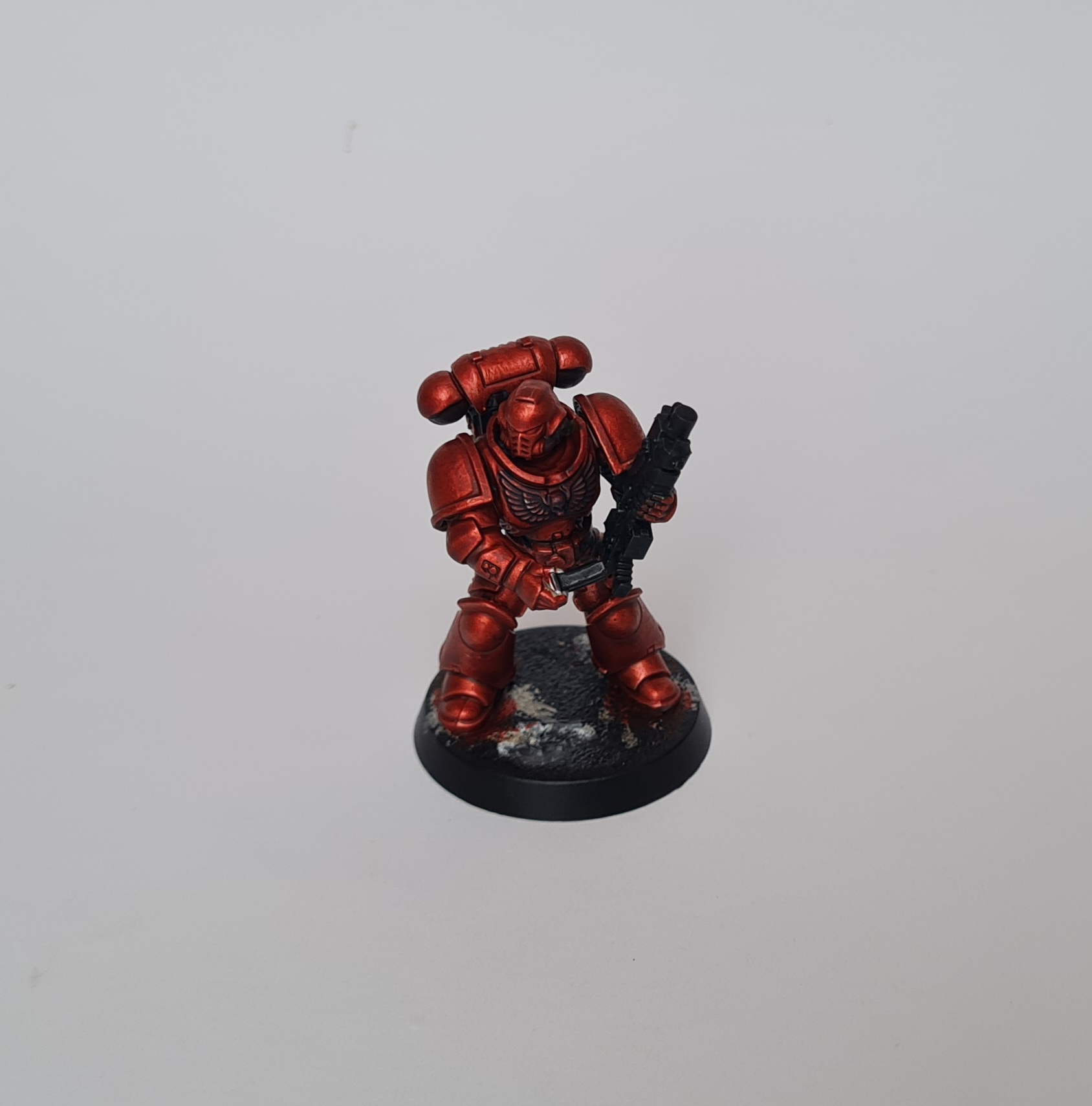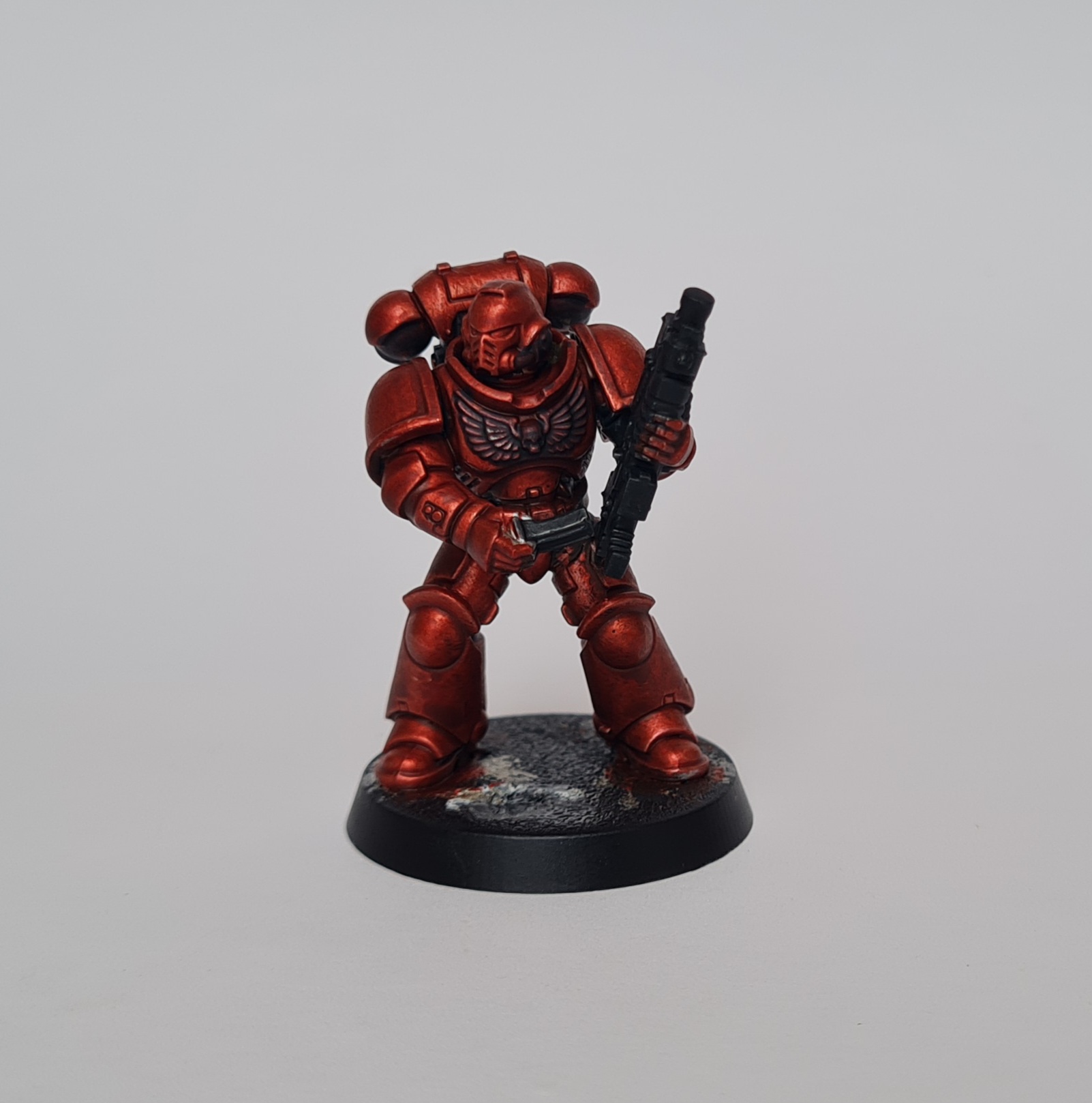 The final test model, which was painted concurrently with one more model that I’ll show at the very end, was a Blood Angel. Basically, I liked the metallic red, I’d looked back over a lot of Migsula’s Blood Angels (mostly for the ‘noble Astartes’ aspect, but always appreciating the paint job), and I thought I’d give this a go and see what I could do with it.