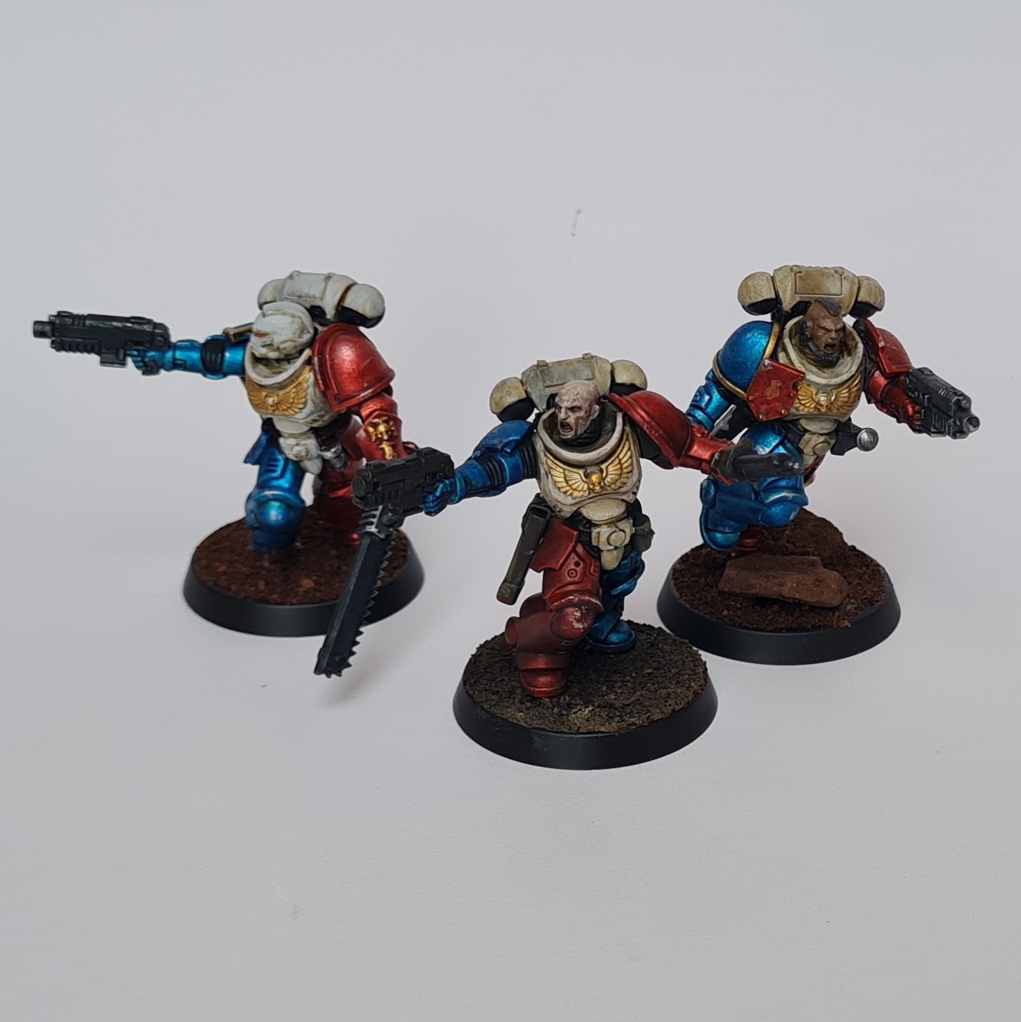 The second test was something I’d wanted to emulate for awhile, Migsula’s Blood Angels in metallic red. I didn’t want to just copy this scheme exactly, and going through my saved Astartes images on Instagram I found two pieces of art depicting a decidedly French marine in metallic red and blue armour split down the middle, but with the torso painted a pale, rich cream. The look was very Crusader, very Chivilrous, and I liked the noble, knightly aesthetic. I painted this with a base (stippled) of Army Painter Hardened Carapace (because I’m now in an apartment and can’t use a rattlecan), then stippled True Brass and Shining Silver as a type of zenithal base coat. Over this I applied Contrast Blood Angels Red and Contrast Talassar Blue. The bare headed marines were painted with a general skin mix - layers of diluted Contrast Skeleton Horde, Guilliman Flesh, and heavily diluted Shysh Purple, sometimes alternating with highlights of diluted Citadel Ulthuan Grey. The torso was painted with layers of Ulthuan Grey and coats of Skeleton Horde. For one of the marines, and then after these photos the other two, I applied a final layer of Ulthuan Grey to make the torse sections clearly ‘white’ instead of ‘dirty cream’. Looking at the photos, I think I actually prefer dirty cream.