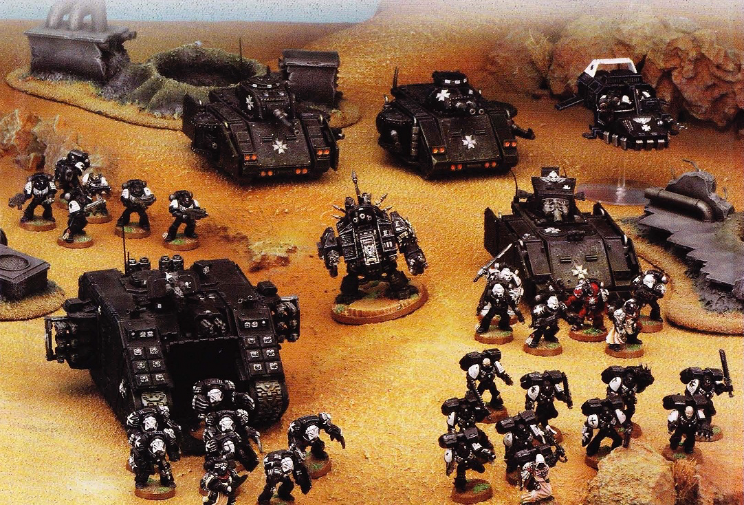 In the first WD I owned there was an early article about a hobbyist’s experience collecting Black Templars. At the time I owned some Warhammer Fantasy (having bought the 6th Edition Starter Box). Warhammer 40k, and Space Marines in general, were a mystery to me. I remember the article discussing the process of collecting the miniatures during a time before there was much lore for the Black Templars, and assembling most of the models with boltguns. When new lore came out describing them as more combat focused, the hobbyist clipped off the boltgun arms and swapped them for chainswords. There was a lot to really enjoy in that article, including an amazing group shot of the models (including a converted dreadnaught) and, what I later realised was actually a photo of Graham Davies’ Black Legion.